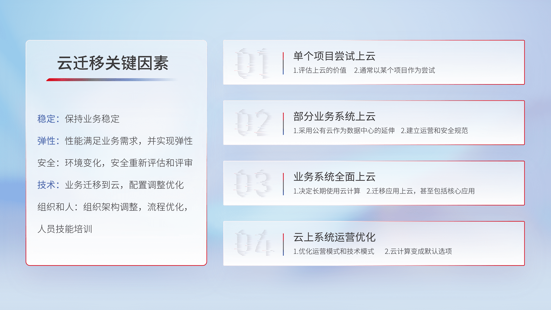 结合实际业务,,,,从规划设计、、、、云平台选型、、云原生改造、、数据迁移、、、集成交付,,迁移全过程为客户识别最佳上云路径,,做好风险识别管理,,,,设计网络架构、、、、身份权限、、安全审计合规、、、操作审计、、、日志审计、、、、监控告警策略、、、、多站点容灾设计等,,对云上基础设施进行整体规划,,提升IT治理水平,,以满足弹性、、、高可用、、高性能的需求。。。。