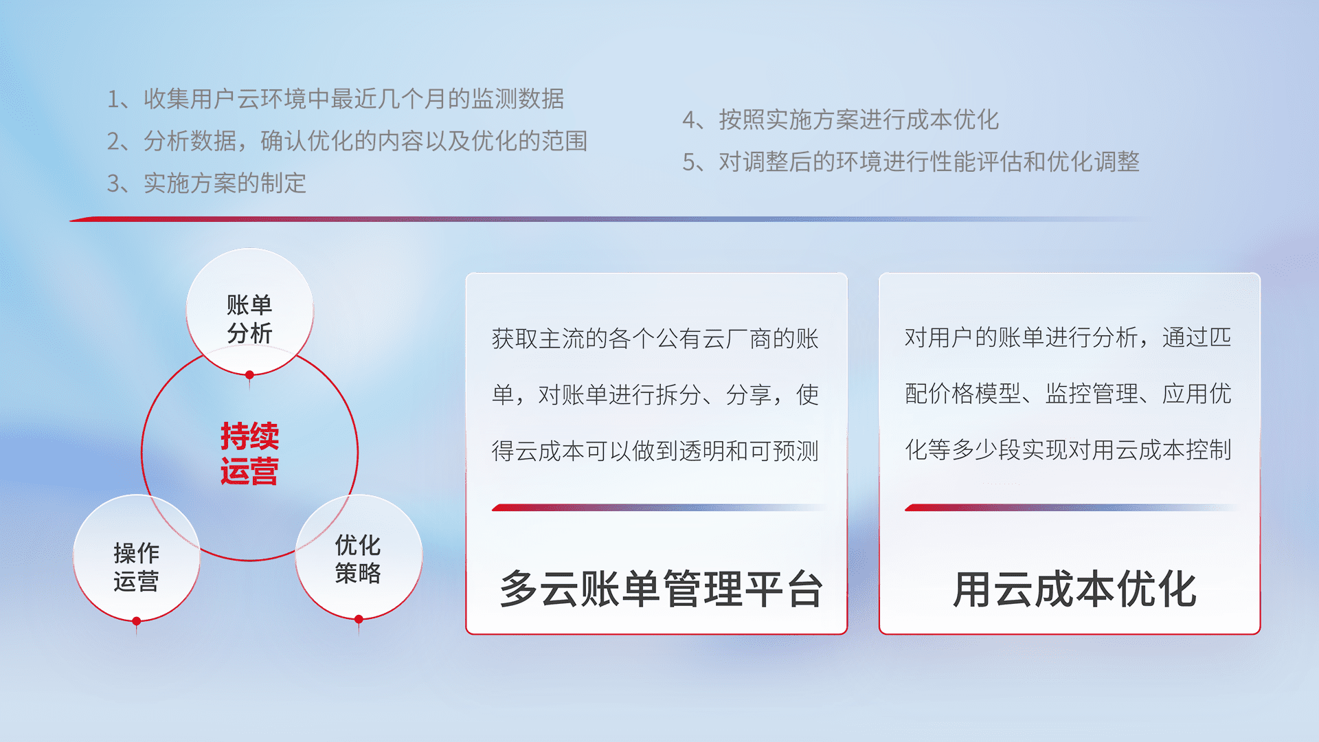 通过多云纳管,,,,以统一的资源数据模型把客户的云资源进行抽象和封装,,,进而实现对多云资源的统一操作,,保障云资源管理的可靠性、、稳定性与可用性。。量身定制化运维内容,,,配置、、开发运维、、补丁管理、、备份、、、、监控、、、认证和访问管理、、审计和日常巡检等,,,保障在用云过程中的可靠度,,,稳定度以及高可用率。。